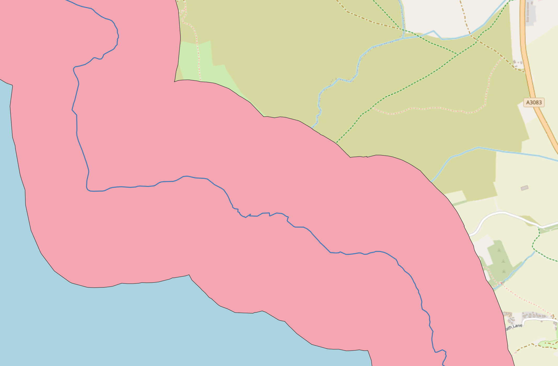 Here we can see the trail in blue, then a buffer is applied (the pink area), before looking at an activity that followed this trail (the faint red line).